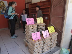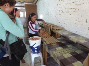 – den 2. Projet gräift an den 1. an :  an der “Granja” liewen eng 3 000 Hénger, déi Eeër leeën. Hei schaffen puer vun de Fraen: si fidderen d ‘Hénger, hiewen d’Eeër op, botzen se, sortéieren se der Déckt no a verkafen se op engem Stand an der Stad Sacaba. Eng Madame huet eng Formatioun als Veterinärassistentin gemaach a kennt sich well gutt aus an der Héngerzuucht.
